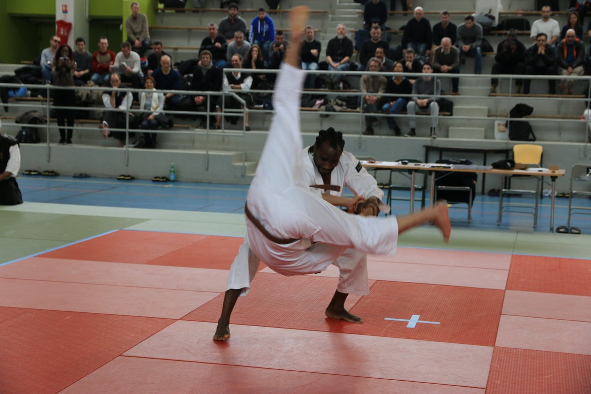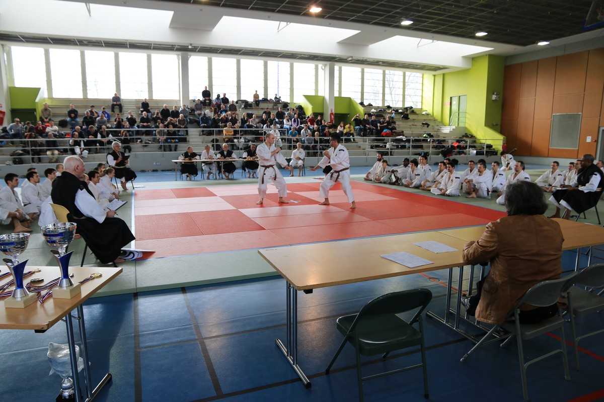 L’après-midi avait lieu la Coupe de France de Shorinji Kempo. 18 couples de kyukenshi, 11 couples de yudansha et un couple hors compétition (également couple dans la vie, 1er kyu et 4e dan) se sont présentés sur les tatamis du gymnase Léo Lagrange, dans le 12ème arrondissement de Paris.